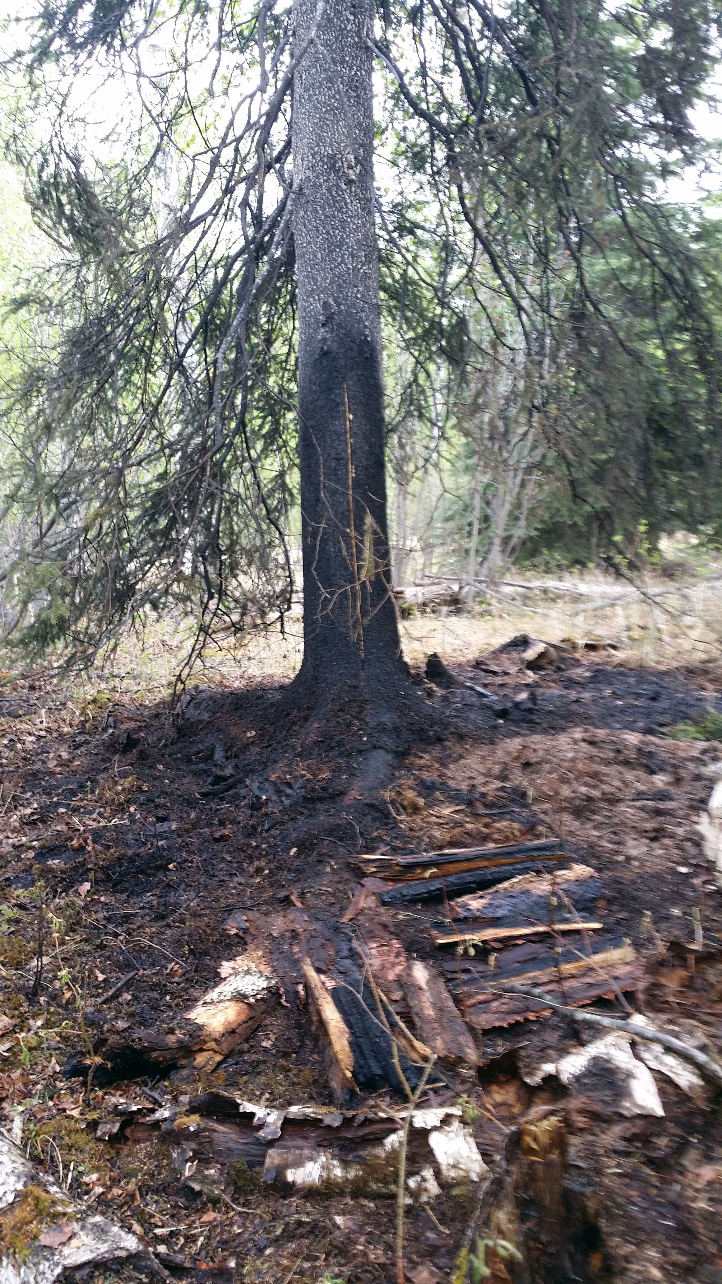 A spruce tree was struck by lightning near Harding Lake southeast of Fairbanks on Thursday, May 16, drawing a response from both Salcha Fire & Rescue and the Division of Forestry. Photo by Elsie Norback/Division of Forestry