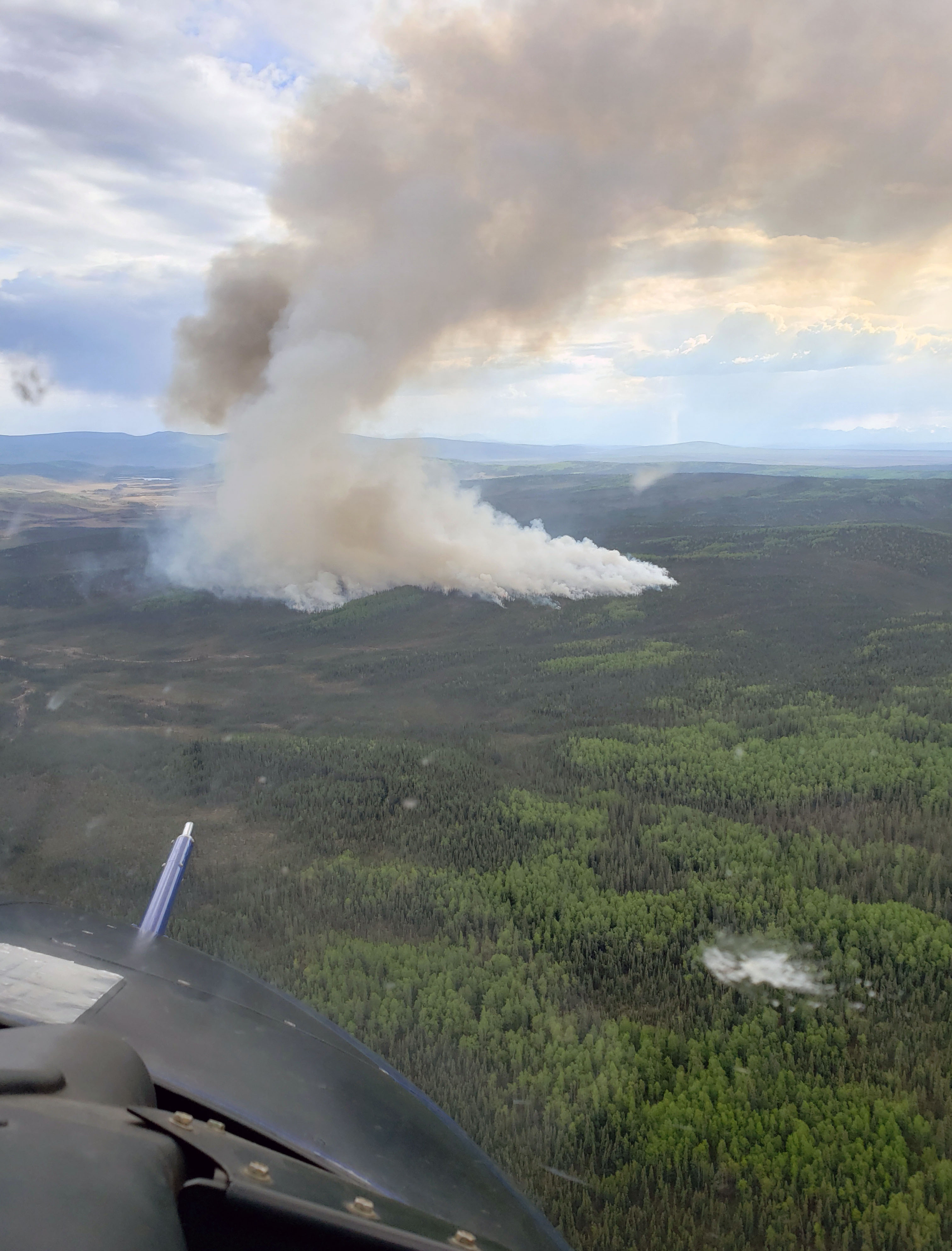 A photo of the McArthur Creek Fire (#133) near the Canada border east of Northway taken from a helicopter responding to the fire. Photo by Forrest Hermanns/Division of Forestry