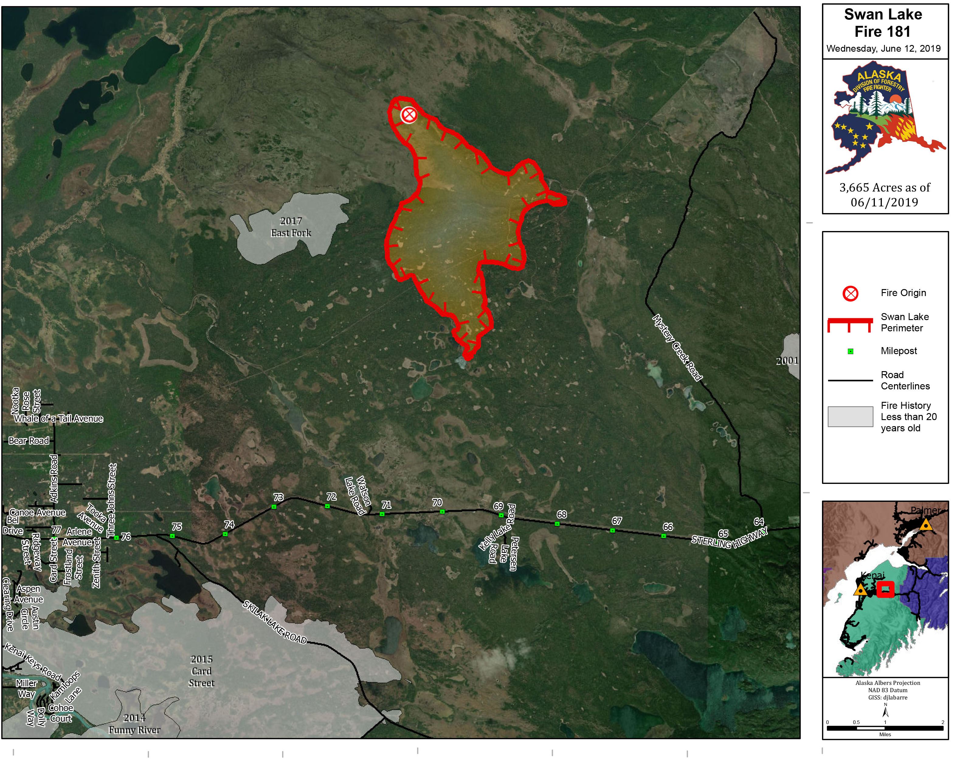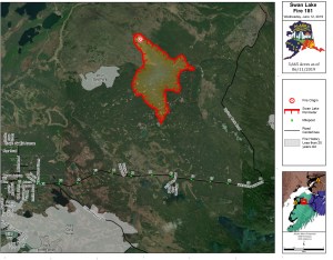 A map showing the perimeter of the Swan Lake Fire (#181) following a reconnaissance flight Tuesday evening, June 11, 2019. For a downloadable version click on PDF map of Swan Lake Fire on June 12