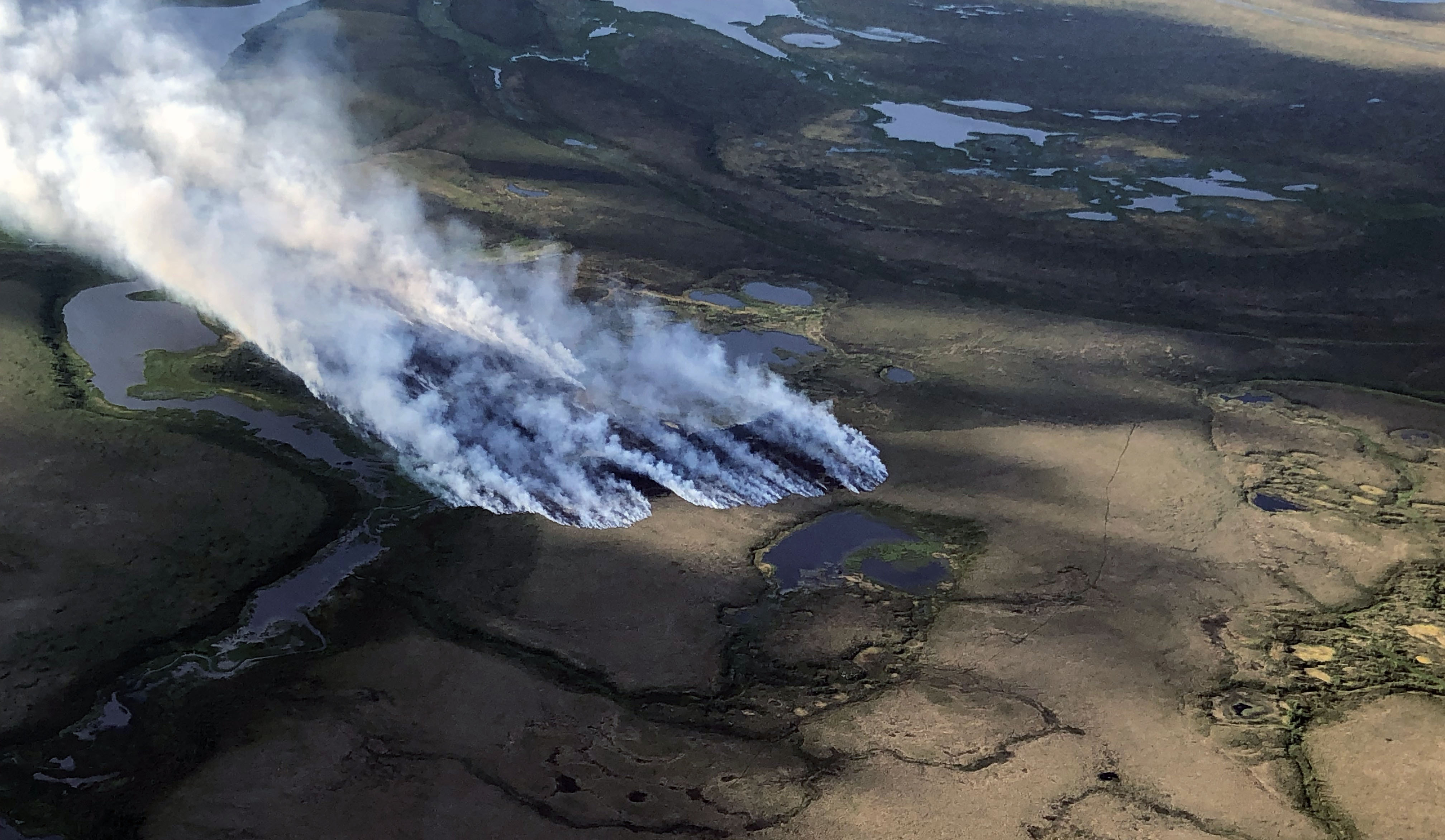 An aerial photo of the 80-acre Kisarlik River Fire (#245) approximately 30 miles west of Bethel taken on Thursday, June 13, 2019. Alaska Division of Forestry photo