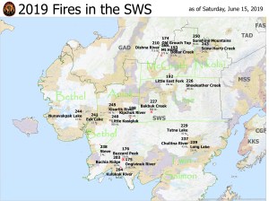- Nunavakpak Lake Fire (#244) – (15 acres). Reported on Jun 13. Located in a Full protection area approximately 33 miles west of Bethel. The fire was flown on Friday and the perimeter was 6% active, smoldering and creeping with winds out of the west at 10 mph. The fire was running into unreceptive fuels and burning itself out.