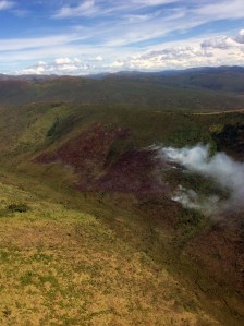 Fire behavior on Monday had moderated significantly since the fire was reported at around 5:45 p.m. Sunday, partly due to an aggressive aerial assault during initial attack and partly because the fire ran into a stand of hardwoods at the top of a ridge that slowed it’s progress. Previously, the fire had been burning uphill through black spruce and was producing a large smoke column visible from North Pole and Chena Hot Springs Road.