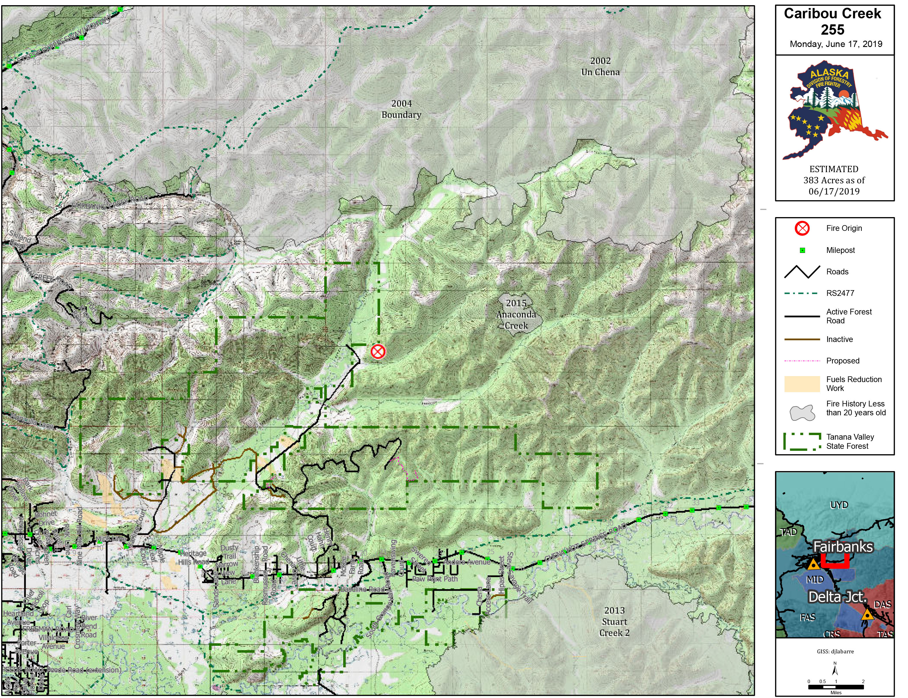 The Caribou Creek Fire is burning about 7 ½ miles north of Chena Hot Springs Road near Mile 18. The fire was mapped at 383 acres by firefighters on Monday, a decrease of more than 100 acres from Sunday’s initial estimate of 500 acres, according to the Alaska Division of Forestry.