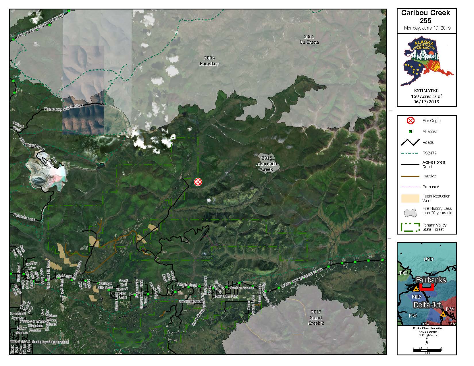 The Caribou Creek Fire (#255) is burning about 7 ½ miles north of Mile 18 Chena Hot Springs Road. As of 11 p.m. Sunday, the fire was estimated at 500 acres. The fire is burning in continuous black spruce on the north side of the Caribou Creek valley and east of the Little Chena River.