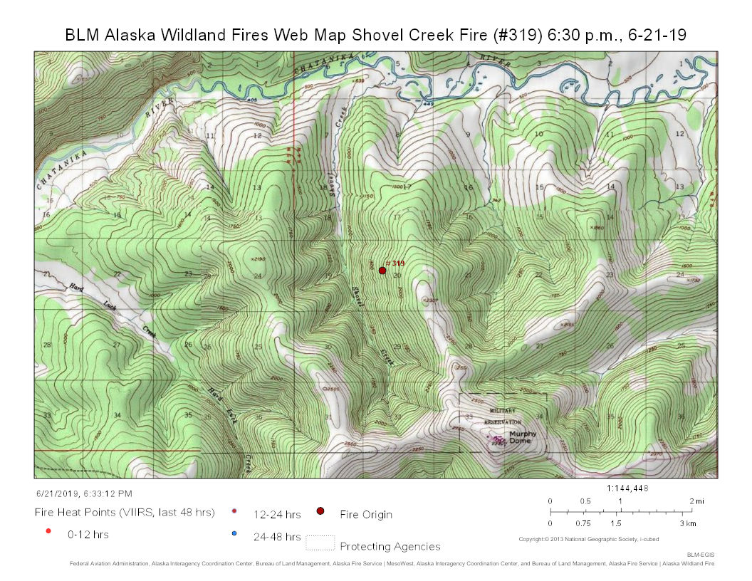 Map of Shovel Creek Fire (#319) burning about 3 miles north of Murphy Dome as of 6:30 p.m. on June 21, 2019. For a downloadable PDF version of the map go to Shovel_Creek_Fire_PDF map June 21