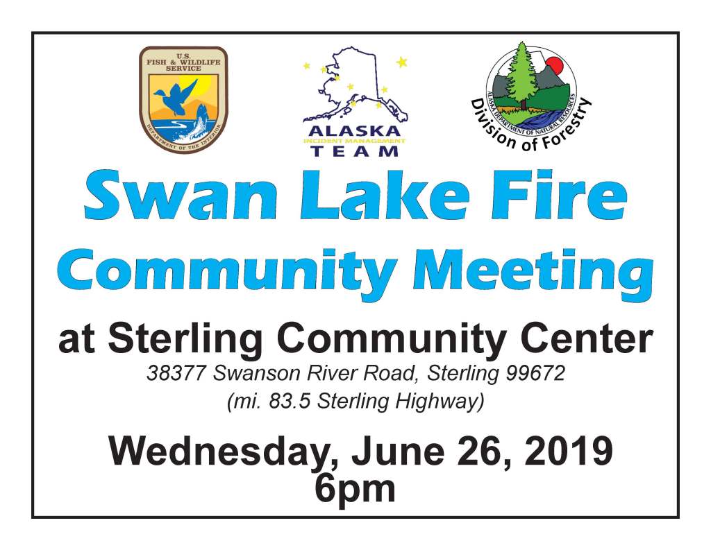 The Swan Lake Fire Community Meeting has been scheduled for tomorrow, June 26th at the Sterling Community Center in Sterling, Alaska.