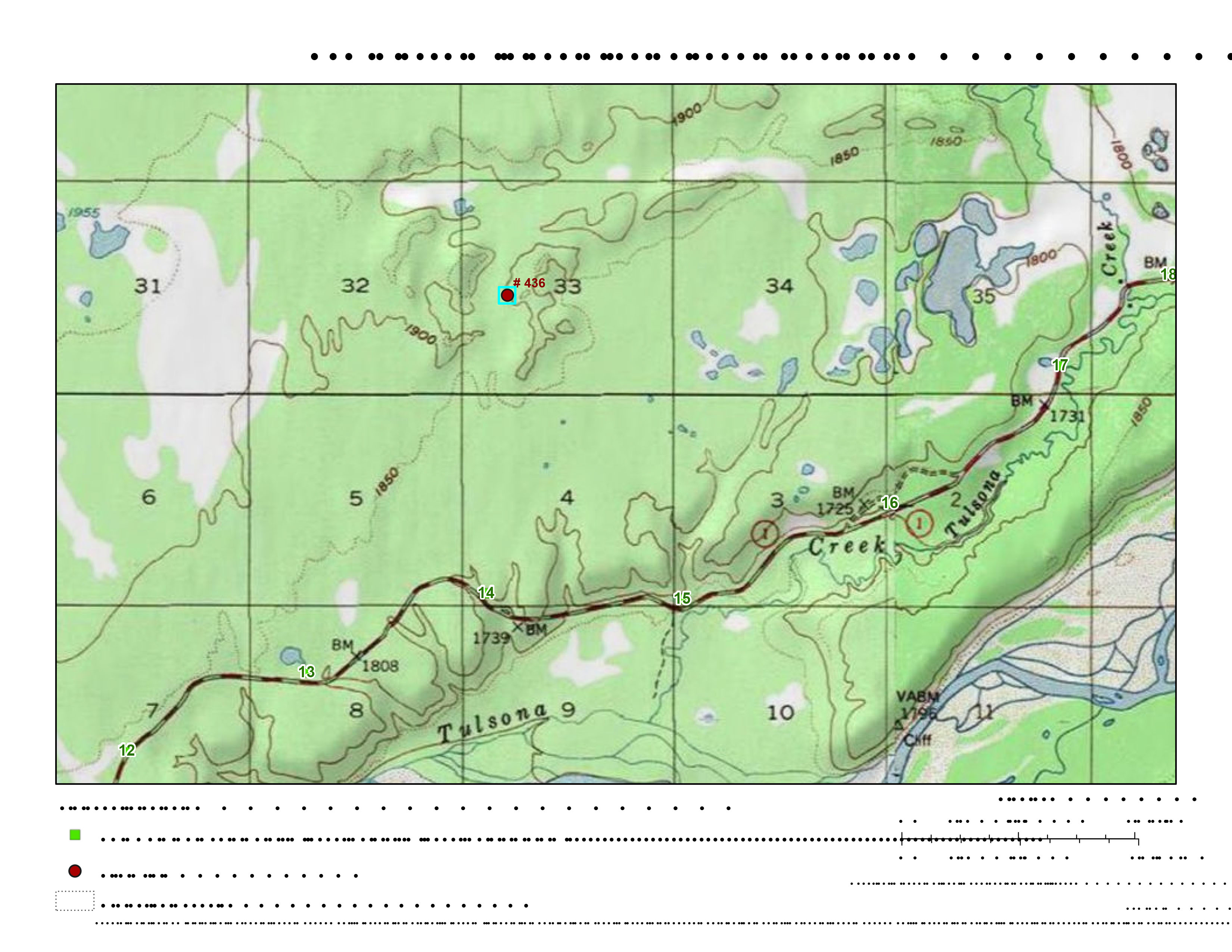 The Tulsona Creek Fire (#436) is burning in black spruce a mile and a half north of mile 14 of the Tok Cutoff. The fire was reported at about 1 p.m. and had grown to 40 acres as of 4 p.m., according to the Alaska Division of Forestry.