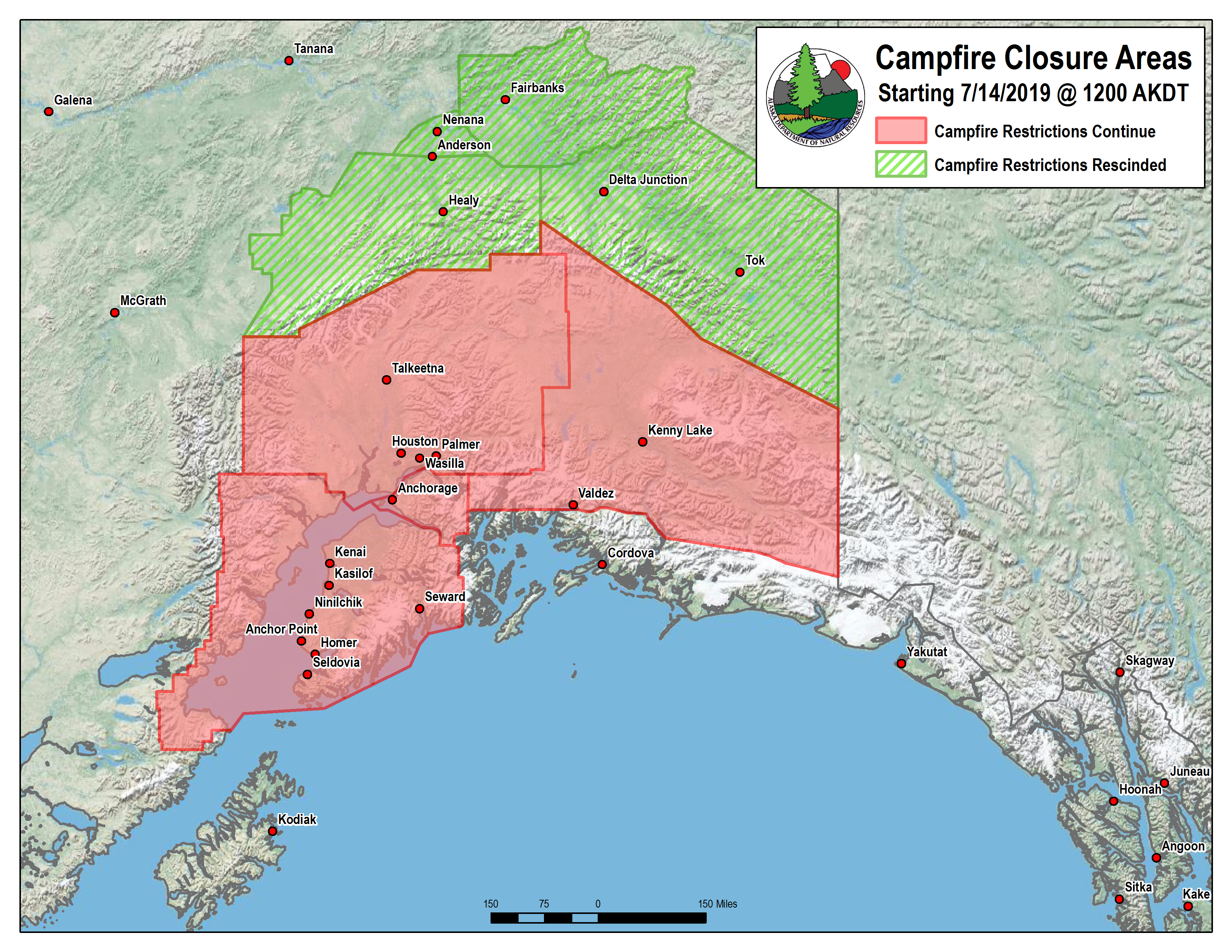 With wildfire danger moderating in some parts of the state due to cooler, wetter weather, the Alaska Division of Forestry is lifting the campfire closure order that was put into effect last week on state, private and municipal lands in the following boroughs and geographic regions effective at noon on Sunday, July 14: