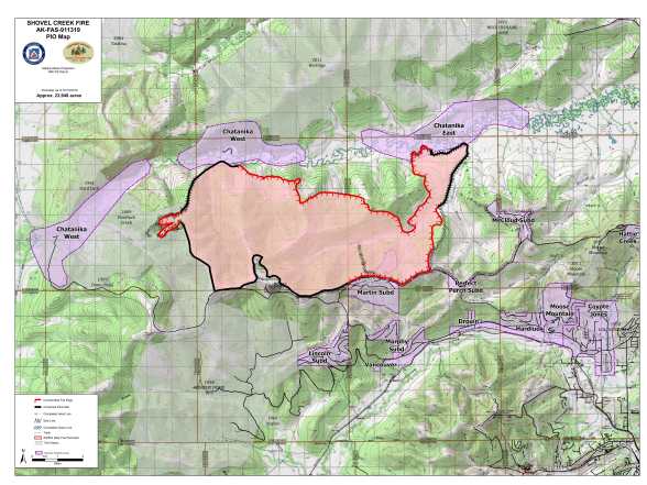 Crews were able to finish removing hoses, sprinklers, and other structure protection equipment from neighborhoods south of Murphy Dome road on Sunday, thanks to the multiple-day effort to mop-up along the southern edge of the Shovel Creek Fire. That equipment can now be refurbished, and made available to other communities threatened by wildfires. Also on Sunday, firefighters patrolling secured line along the northeast corner of the fire near the Chatanika river report the line is holding, and that they’ve been able to release the hotshot crew that had been working to improve the line in that area. Structure protection equipment remains in place north of the Chatanika, if needed.