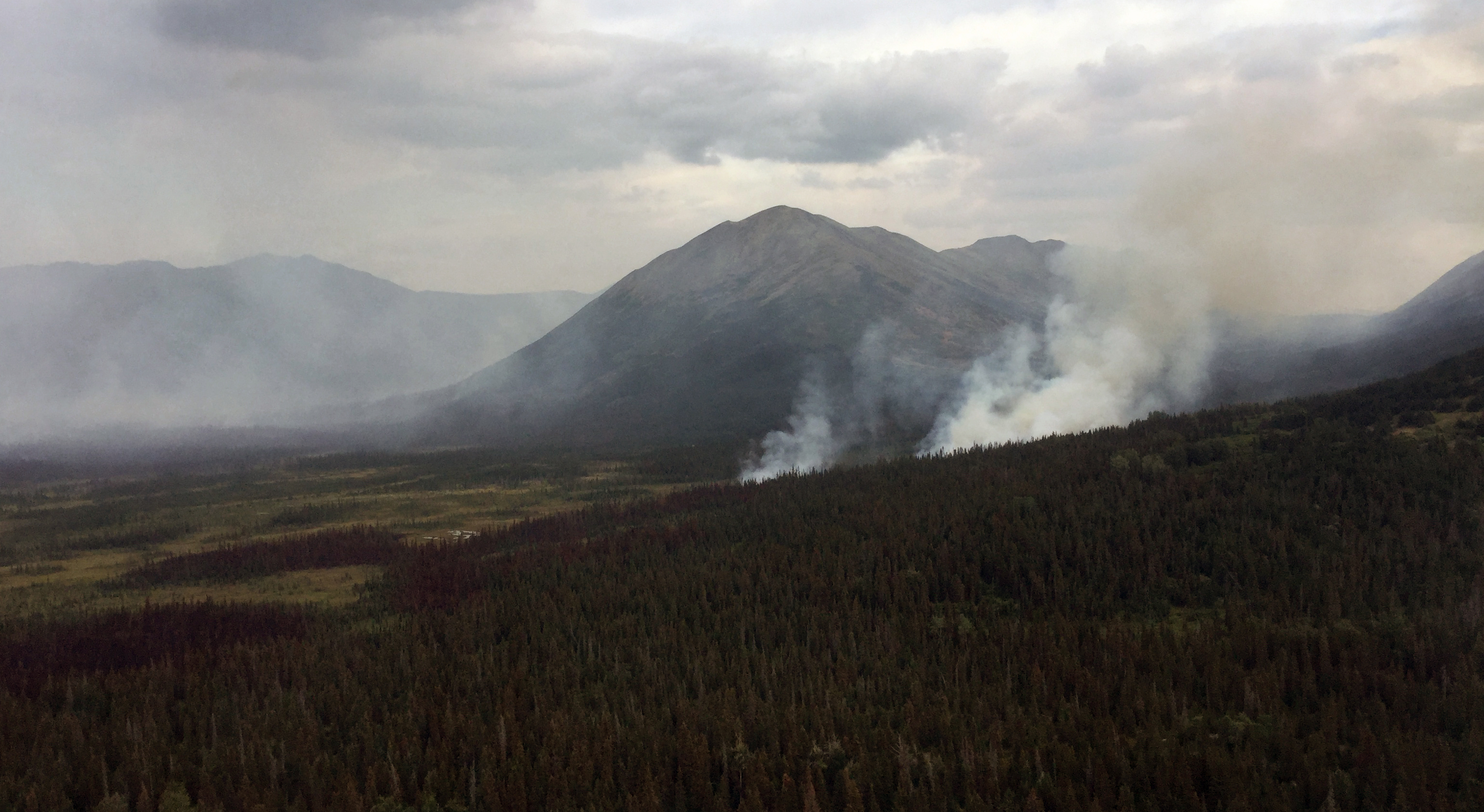 Smoke from a spot fire just off the perimeter of the Swan Lake Fire in the Mystery Creek drainage northwest of Fuller Lake as seen from the air on Thursday, August 16, 2019. Fire personnel will be scouting that area today to see if there is a threat to the Fuller Lake Trail. Photo by Brentwood Reid/Alaska Division of Forestry