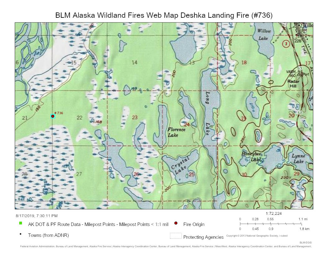 The Deshka Landing Fire (#736) near milepost 68 of the highway, meanwhile, is estimated at 200-plus acres. At last report it was one-half mile from South Rolly Campground and fire managers have issued an evacuation notice for the campground. Fire personnel are also contacting anyone staying in cabins on Red Shirt Lake to prepared for a possible evacuation.