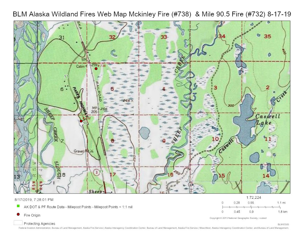 State forestry is also working to contain an approximately 100-acre wildfire burning near Deshka Landing, about 22 miles to the south of the McKinley Fire. The Deshka Landing Fire is burning about 4 ½ miles west of the Parks Highway near Mile 68 and is within one-half mile of multiple recreational cabins along the Susitna River northeast of the fire.