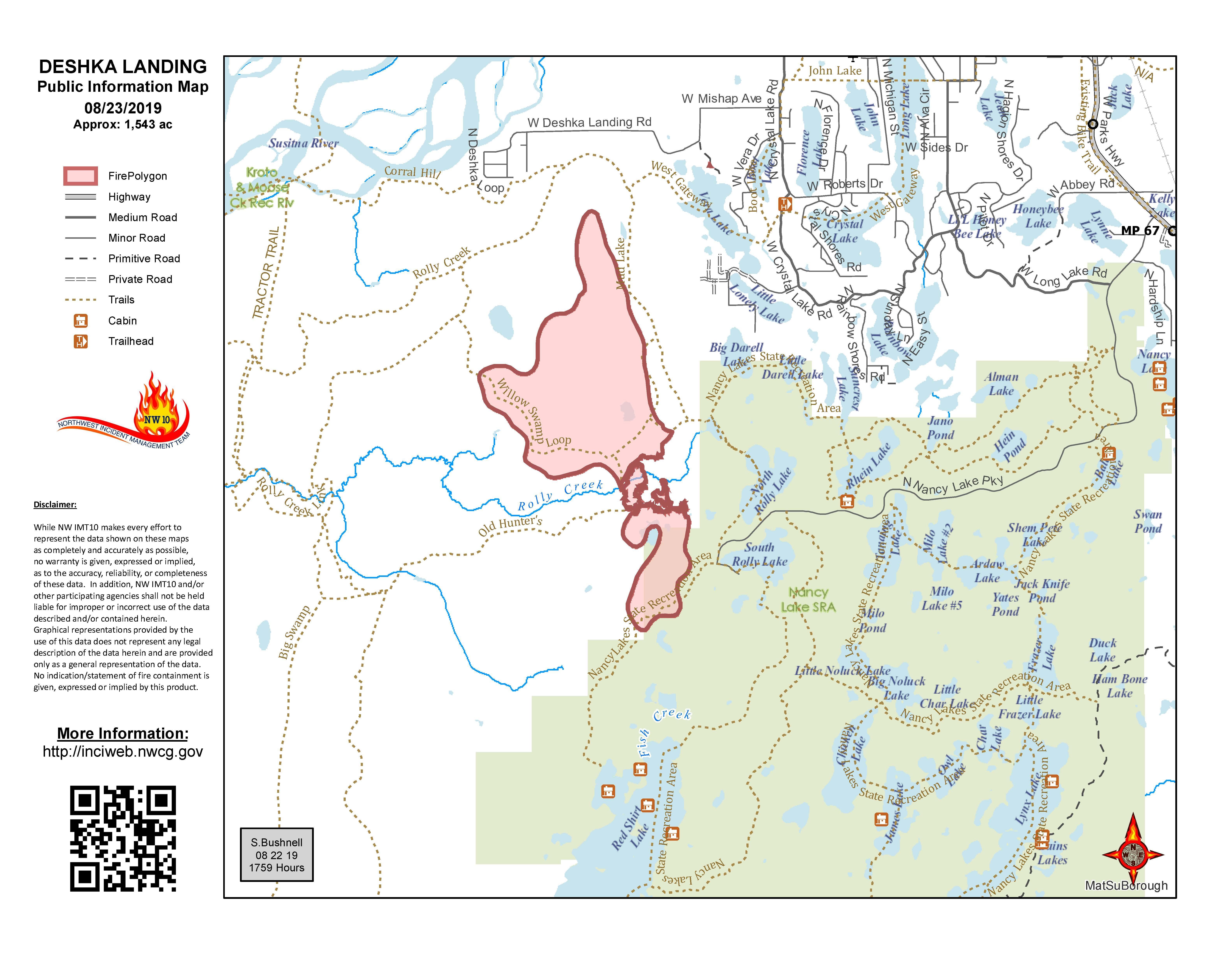 A perimeter map of the 1,543-acre Deshka Landing Fire as of Aug. 22, 2019. For a downloadable PDF map, go to Deshka Landing Fire PDF Map Aug. 23.