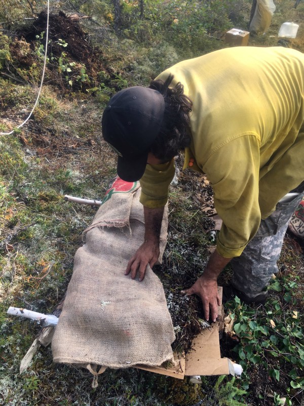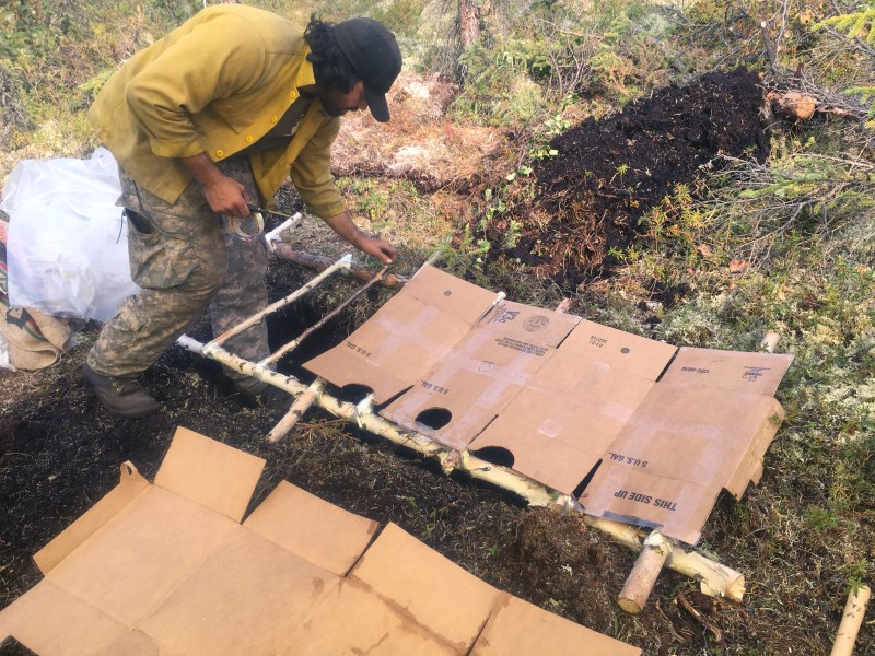Because there are no facilities nearby, fire camps need to be self-sufficient. Camps are based on distance to fires and easy access for helicopters to deliver people and supplies. There is a pantry area created to store fresh food with an assortment of canned goods, vegetables, meats, cheeses, tortillas and bread. A tundra refrigerator is a hole dug down to the permafrost and covered with a makeshift lid to keep perishable goods cool for several days. Wash basins and kitchen areas are fashioned by fresh food boxes and empty cubies – 5-gallon containers used to hold drinking and cooking water. Each crew digs its own latrine.