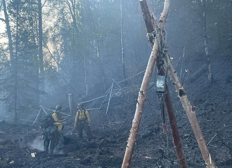 The North Fork Talkeetna Fire (#095) 10 miles northeast of Talkeetna near a private cabin was reported by Talkeetna flight service yesterday afternoon. Mat-Su Helitack responded to this full suppression fire and did bucket work to limit the fire spread uphill. The Gannett Glacier Fire Crew, having just completed critical training and currently with 14 firefighters on the roster, was inserted and will remain today to continue mop up and patrol. Last night and this morning the crew was able complete the saw line, extinguish both “candling trees” within the fire area and spot fires outside of the perimeter. Superintendent Bryan Quimby reported “Mat-Su Helitack did a fantastic job with the quick response knocking down the fire until we could get on scene. With the spring conditions the ground fuels are very dry but the fire was unable to burn deep into the tundra which continues to dry out.”