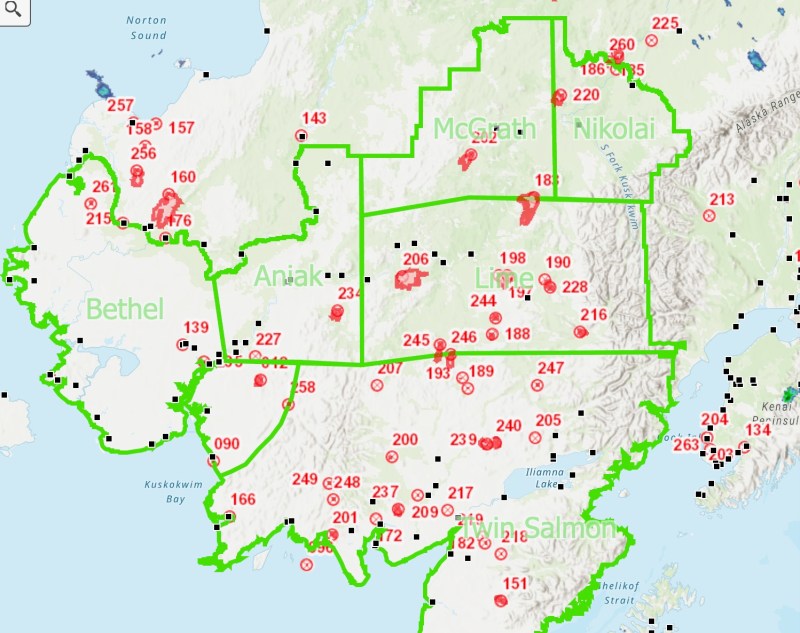 Only three of the fires are currently staffed with additional resources arriving from the Lower 48 and Canada to augment the Alaskan firefighting resources. Six water scooping aircraft from BC arrived yesterday to assist with the suppression efforts. The Aghaluk Mountain Fire (94,953 acres) is 10 miles southwest of Sleetmute along the Kuskokwim River. Firefighters from the DOF and the BLM Alaska Fire Service are on the ground in Sleetmute preparing to protect that community should the fire advance that fire in the coming days. The Submarine Creek Fire (17,920 acres) is 6 miles northwest of Medfra. On June 6th the fire burned through the Nixon Fork Mine, damaging the facility and mining infrastructure. Firefighters are working with the locals have secured the remaining infrastructure and are working to preparing to defend the Medfra community should the fire advance to the southeast. Six Fire Boss aerial firefighting resources were working the 16 acre Pauls Creek Fire (219). The Alaska Type 2 Green Team is managing the East Fork Fire (121,831 acres) near St Mary’s, and the Alaska Type 2 Black Team is being mobilized to help managing many of the fires between the Kuskokwim River and Dillingham.”