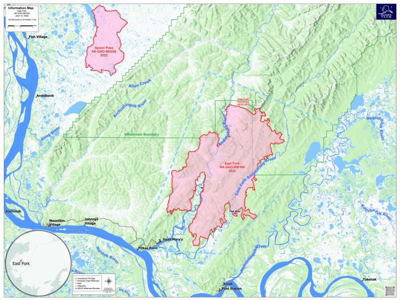 Aerial monitoring of both the East Fork and Apoon Pass fires will continue to occur daily in order to identify any allotments or structures that may be at risk. As a reminder, temporary flight restrictions remain in effect (https://tfr.faa.gov/tfr2/list.jsp).