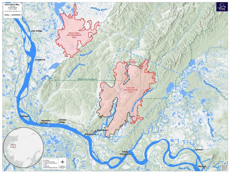 Today, crews will continue to work the active edges of the fire on the western flank and on the southeastern edge to gain further containment. As the fire moves north into the wilderness, the Team will focus on the protection of allotments along the Andreafsky River north of the East Fork Fire and northwest of the Apoon Pass Fire. Crews are moving upriver from Pilot Station to assess allotments to the east.