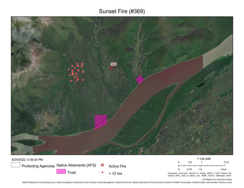 Twelve smokejumpers are fighting the Sunset Fire (#369), which is burning near the banks of the Yukon River about 60 miles upriver from Ruby. The fire is in a Full Protection area. Two allotments between the fire and the river are threatened.