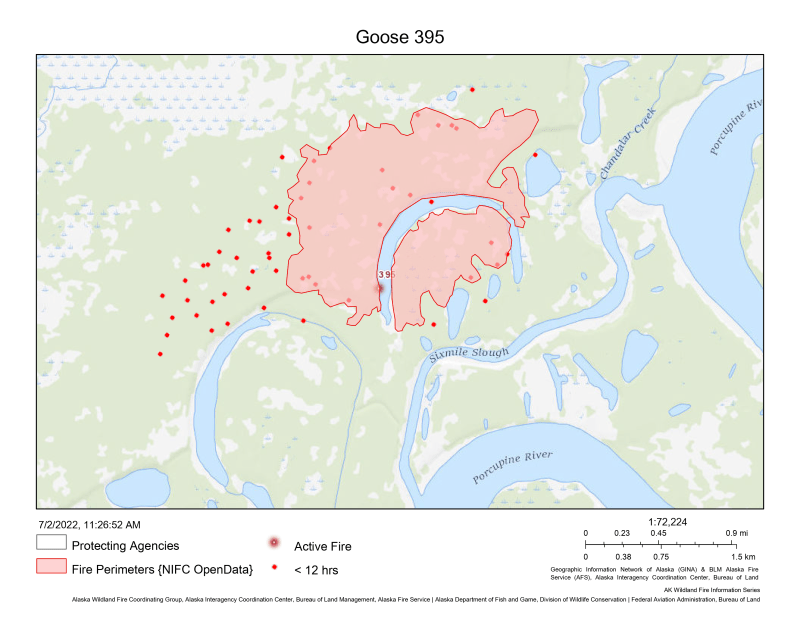 Twelve smokejumpers are working on the Goose Fire (#395). Yesterday they were able to install hoses along the north and northwest flanks of the fire. They are working to keep the fire to the west of the Belle Lake allotments. No significant growth was reported on the fire on Friday. Crews used a boat to scout upstream on the Porcupine River to assess the allotment located further east of the fire. Additional firefighters will arrive at the Goose Fire in the next operational period.