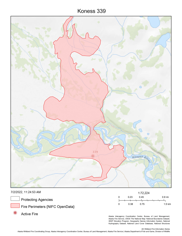 The Koness Fire (#339), 40 air miles southeast of Arctic Village, is about 3.25 miles from an allotment and is in a Limited protection zone. Twelve smokejumpers are clearing brush and other vegetation away from a cabin on the allotment and are beginning to set up structure protection. They are also flagging to cut a saw line around the allotment.