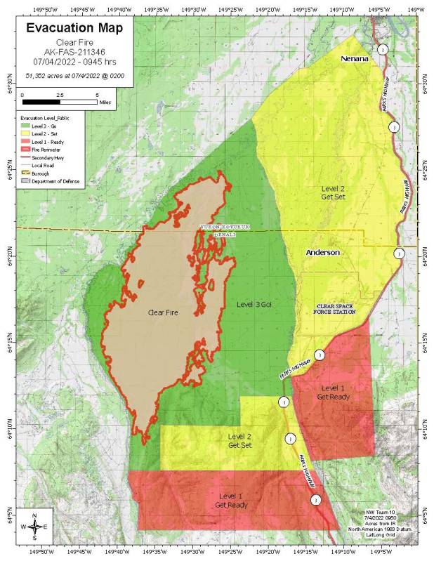 Set (Prepare your “go bag”): All areas WEST of the Nenana River between Parks Highway MP 269 – 274. The City of Anderson, Clear and Clear Space Force Station. All areas EAST of the Nenana River between Parks Highway MP 275 – 302. All cabins along the Teklanika River between two and five miles of the current fire perimeter.