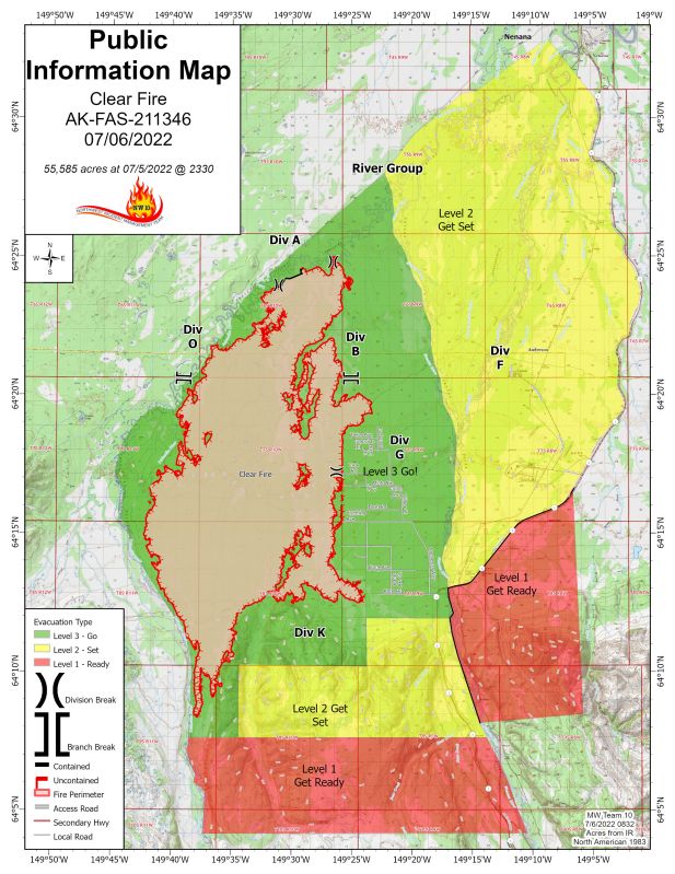 Sheltering or evacuation-related information: Contact the Denali Borough at (907) 683-1330, see the Borough’s Facebook page or visit denaliborough.org All other fire information: Clear Fire Information, (907) 290-2921; Alaska Fire Information, (907) 356-5511; akfireinfo.com, inciweb.nwcg.gov/incident/8178, and on the Alaska Division of Forestry and BLM Alaska Fire Service Facebook pages.