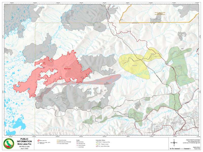 Please continue to limit unnecessary travel to areas around the fire perimeter where fire personnel are working. This includes the Murphy Dome area down to the MDR Boat Ramp and the Chatanika River. Equipment and fire fighters are working around the Hayes and Himilaya Subdivisions, please use caution in these areas. The fire area remains under a fuels and fire behavior advisory. Fuels and Fire Behavior Advisory.