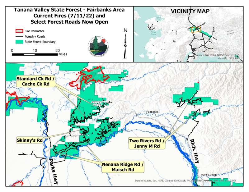 (Fairbanks, AK) – Beginning on July 12, 2022 at 8:00 A.M., the “Tanana Road Closure Order” will be partially rescinded to allow Tanana Valley State Forest (TVSF) access for motorized use on several logging roads around Fairbanks. Specific roads to be reopened include Maisch Logging Road (MP 312 Parks Highway), Nenana Ridge Road (Mile 327 Parks Highway), Skinny’s Road (Mile 328 Parks Highway), Standard Creek Road (Old Nenana Highway), Cache Creek Road (Murphy Dome Road), as well as the Two Rivers Road and Jenny M Road (Two Rivers area of Chena Hot Springs Road). These forest roads are shown on the map attached.