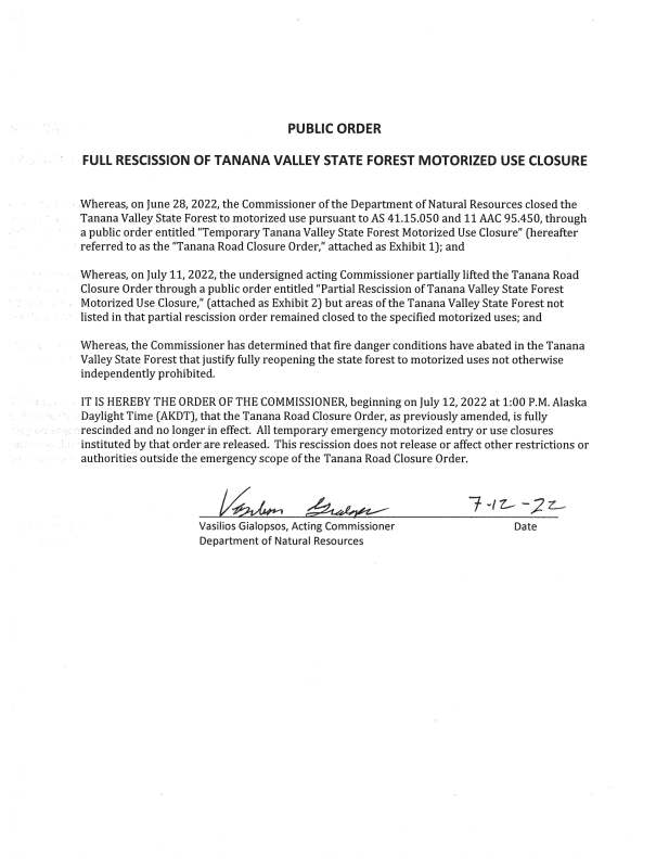 (Fairbanks, AK) – Beginning on July 12, 2022 at 1:00 P.M., the “Tanana Road Closure Order” is rescinded to allow motorized use of the Tanana Valley State Forest. Several logging roads had already reopened at 8:00 A.M.