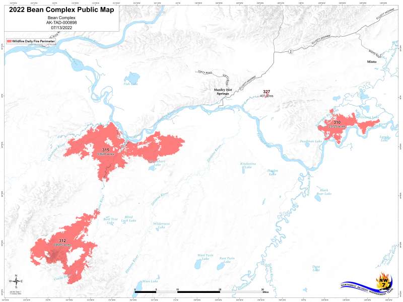 On the Bitzshitini Fire (#312), about 23 miles southwest of Manley Hot Springs and south of the Tanana River, firefighters have completed the objective of point protection for structures. The fire is now unstaffed and in patrol by air status. This fire has grown to 65,079 acres.