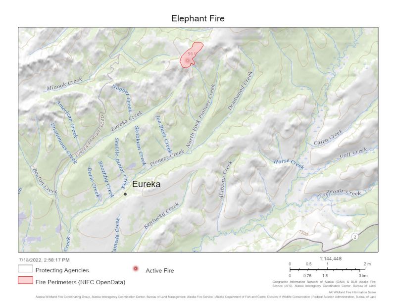 Elephant Fire (#561): 128 acres with 0% containment. Once detected, several aircraft and 12 smokejumpers were immediately assigned and, coupled with the precipitation that was received yesterday, they were able to make good progress. A hotshot crew is en route to the incident. The fire is in an area of dense brush and a hard to access drainages. Despite these challenges, firefighters are working diligently to protect values at risk near the community of Eureka and the Eureka Rampart Road. Fire suppression resources are working toward securing fireline around perimeter.