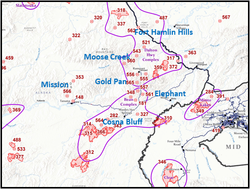 Fort Hamlin Hills (#562): 468 acres, approximately 14 miles north where the Dalton Highway intersects the Yukon River. The fire grew in size yesterday, increasing by 463 additional acres. It remains in monitoring status.
