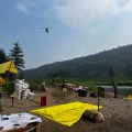 View of a type 2 helicopter loading water from the Chatanika River with the crew spike camp in the foreground. USFS Picture