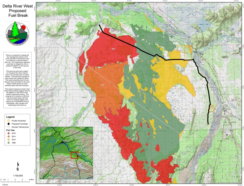 Residents of Delta Junction, Fort Greely and homeowners in the surrounding areas have a deep understanding of the frequent fire return interval in this part of interior Alaska. Large wildfires totaling nearly 200,000 acres threatened this area in 1998, 2013, 2014 and most recently with the 2019 Oregon Lakes Fire. A coordinated interagency effort has been underway for years between DOF, the Bureau of Land Management Alaska Fire Service (BLM AFS), and the 11th Airborne Division. Fire managers from several agencies have been working to mechanically remove hazard fuels in the fuel break constructed in the Donnelly Training Area West (DTAW), along Fort Greely and west of Delta Junction.