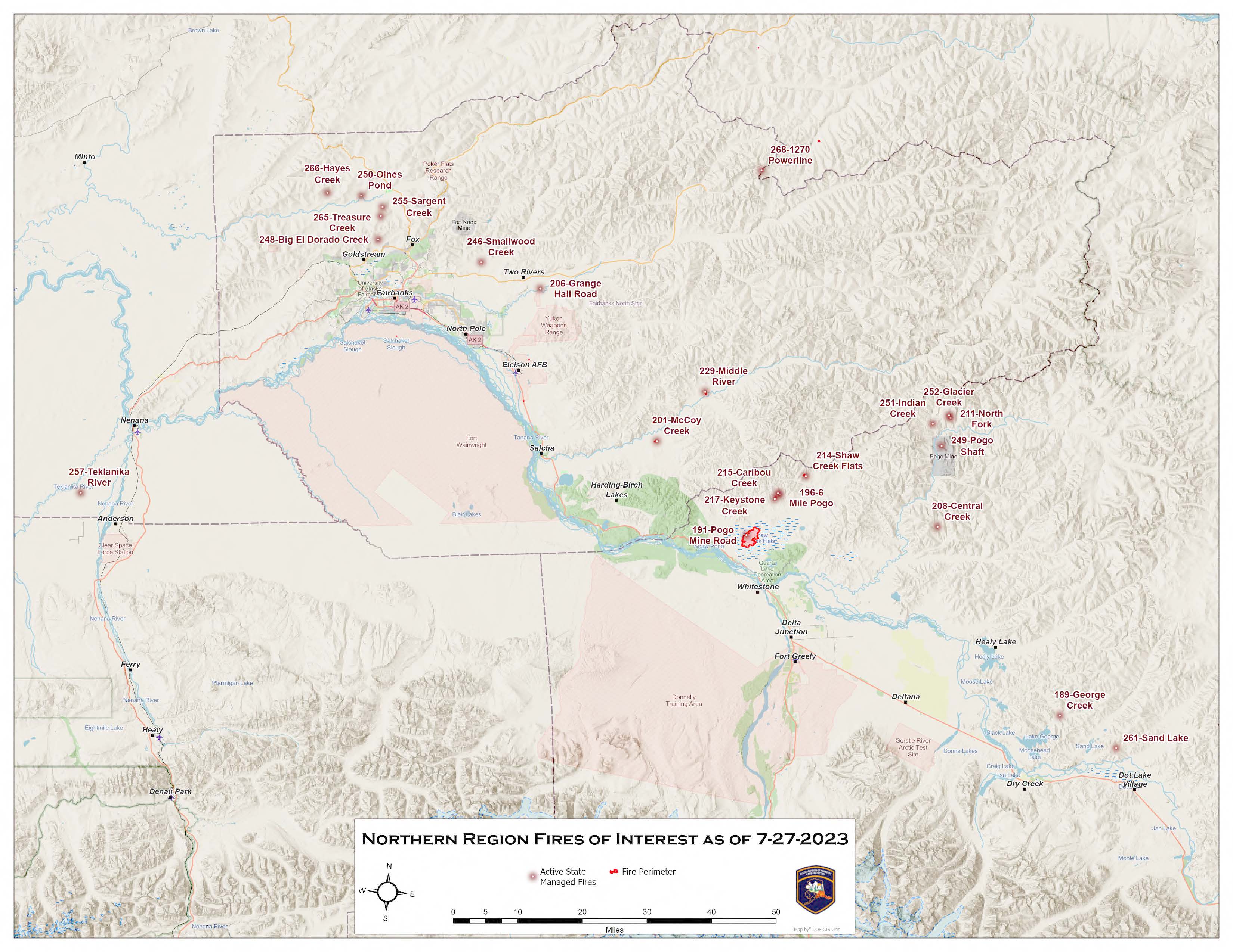Pogo Mine Road Fire (#191): Delta area resources along with Tanana Chiefs Crew continue to monitor the fire and secure the Pogo Mine Road. The fire is currently 3,068 acres.