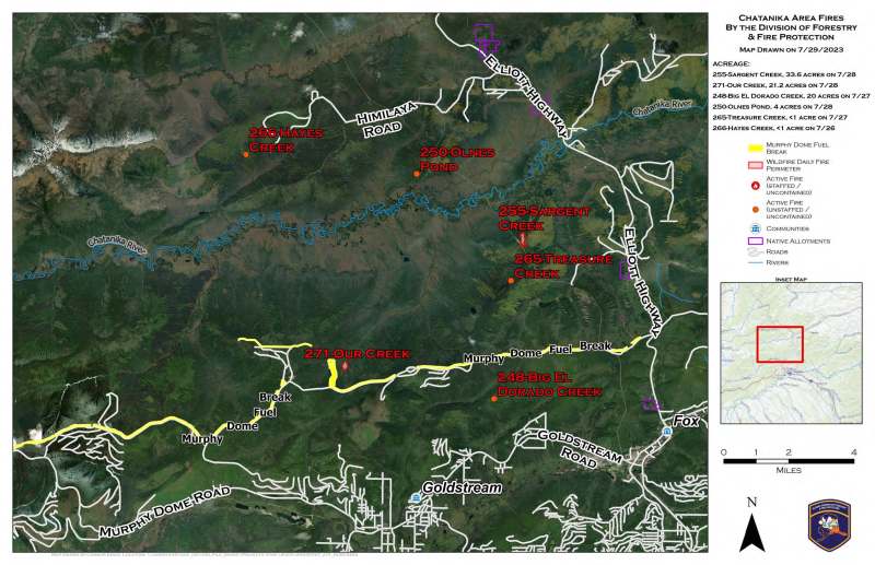 Our Creek Fire (#271) – [18+ acres] .5 miles north of Old Murphy Dome Road. DOF personnel and crews continued working and securing the fires edge with line and hose lay while helicopters continued suppression with bucket operations. The fire is boxed in on two sides by the Old Murphy Dome fuel break which is aiding in preventing the fire from threatening communities south of the dome road.