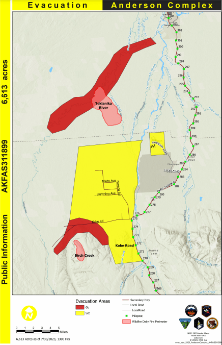The city of Anderson and all residents that use any road west of the George Parks Highway between milepost 270 and the Rex Bridge are in Evacuation Status SET. Individuals in this area should be ready in a moment’s notice.