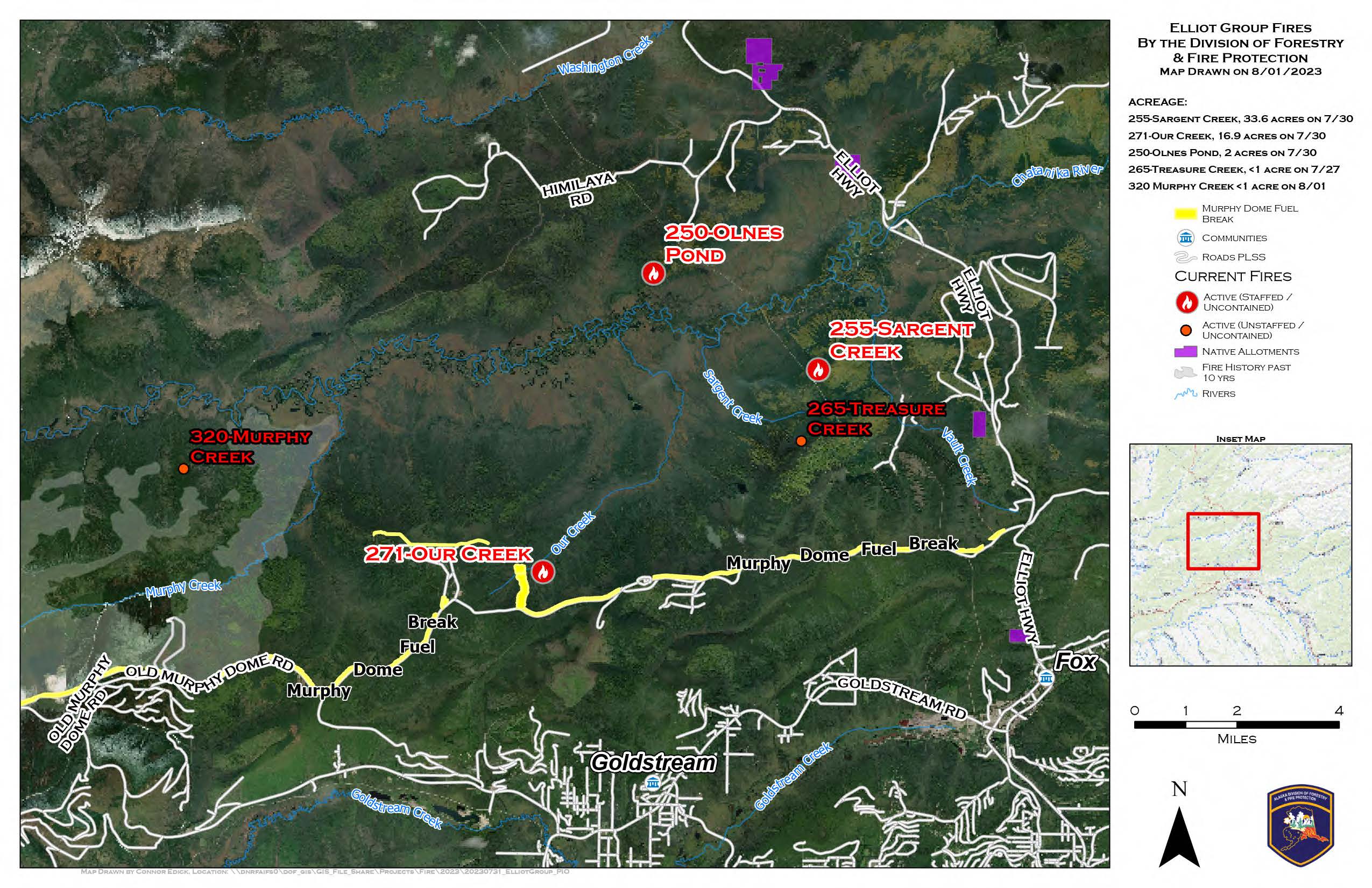 Elliott Group – [54 acres] North of Old Murphy Dome Road, Fairbanks. Firefighters continue working with assistance of aerial resources to further suppression efforts on the Our Creek (#271), Sargent Creek (#255), Olnes Pond (#250), and Treasure Creek (#265) fires. (88 personnel)