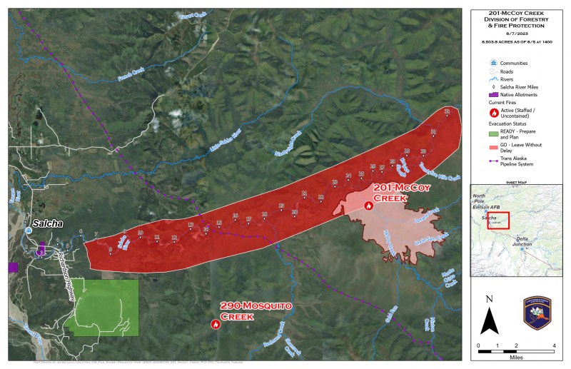 A GO! evacuation status remains in effect for Fairbanks North Star Borough residents in the Lower Salcha River, approximately from river mile 3 to 40. The Middle Salcha remains in Set status, approximately river mile 40 to 61.