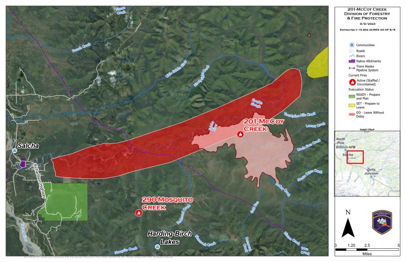 Firefighters were actively engaged on the McCoy Creek Fire Tuesday. Assessment of structures between river mile 15 and mile 32 was completed. Firefighters are also constructing direct line on the eastern flank of the fire, working to halt fire’s progression in that direction. The priority on the McCoy Creek Fire remains keeping the main fire on the southern side of the Salcha River, and preventing damage to the many cabins and properties along the river.