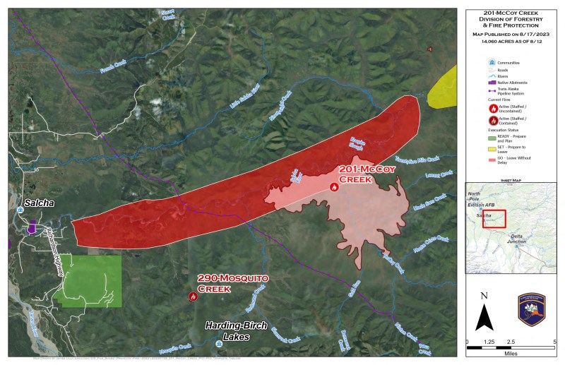 EVACUATIONS: A GO! evacuation status remains in effect for Fairbanks North Star Borough residents in the Lower Salcha River, approximately from river mile 3 to 40. The Middle Salcha remains in Set status, approximately river mile 40 to 61.