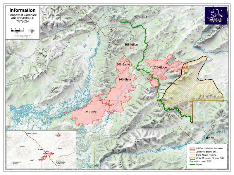 The Grapefruit Complex includes the Globe Fire (#253), Iver Fire (#249), Eagle Fire (#306), Wilber Fire (#308), Noodor Fire (#192), and Fossil Fire (#115). Crews continue to limit the fire’s impact on the Elliott Highway, Trans-Alaska Pipeline, Native allotments, and public and private structures, as well as reducing impacts to fish habitat along the Tatalina and Tolovana river corridors.