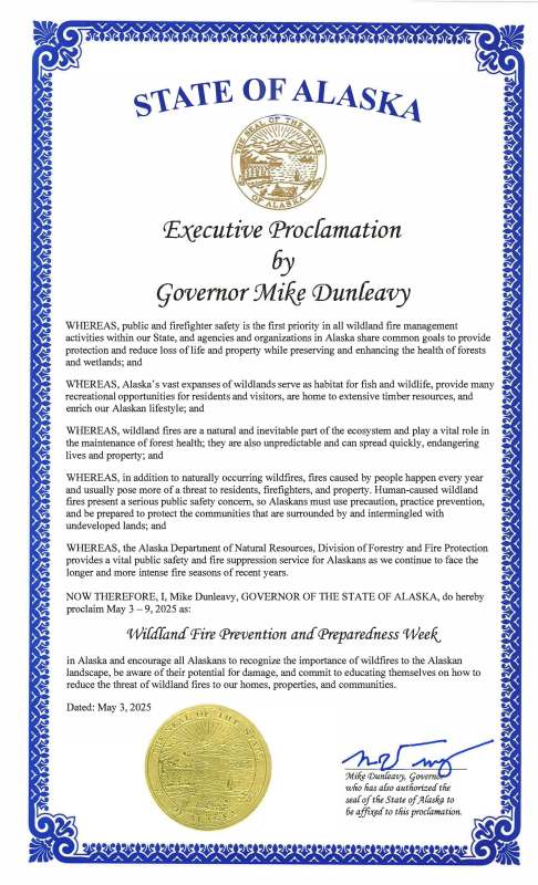 Gov. Mike Dunleavy has proclaimed May 3rd–9th, as Wildland Fire Prevention and Preparedness Week in Alaska. This serves as a timely public reminder that while wildland fire is a natural part of Alaska’s landscape, it can quickly become dangerous, especially when caused by human activity. The governor stresses that Alaskans must use precaution, practice prevention, and be prepared to protect their communities that are among Alaska’s wilderness areas.