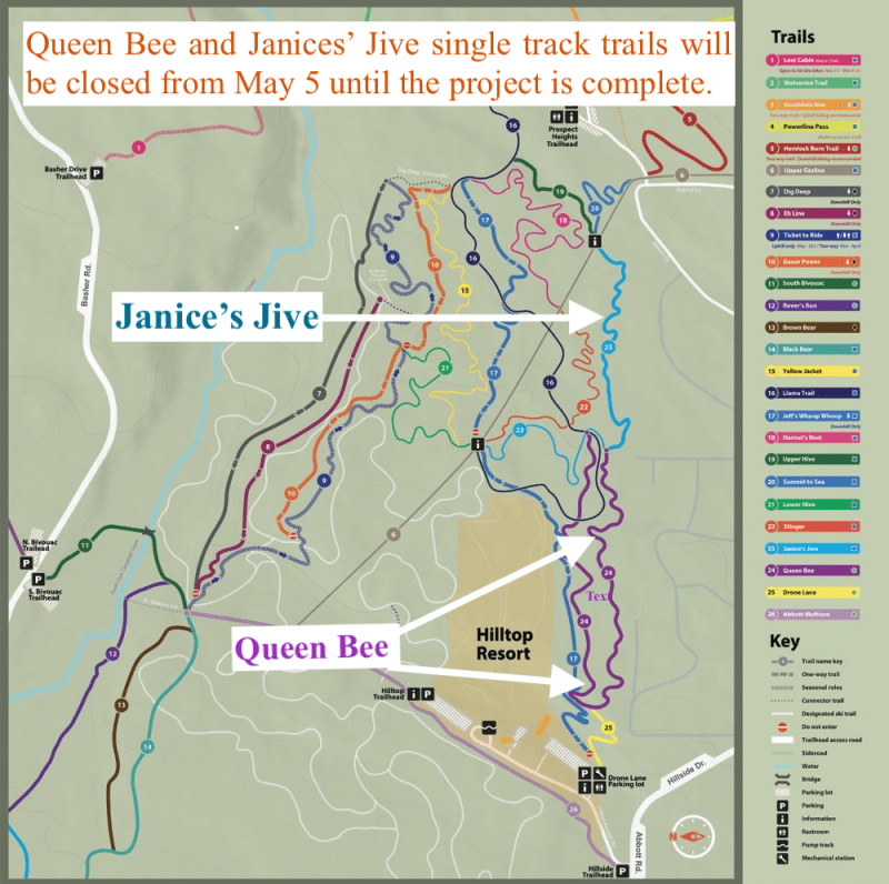 Trail closures will be in place for the duration of the project and will include Queen Bee and Janices Jive, two popular trails on the Hillside Singletrack Trail System. The closures protect the public from the hazards of fuels mitigation work.