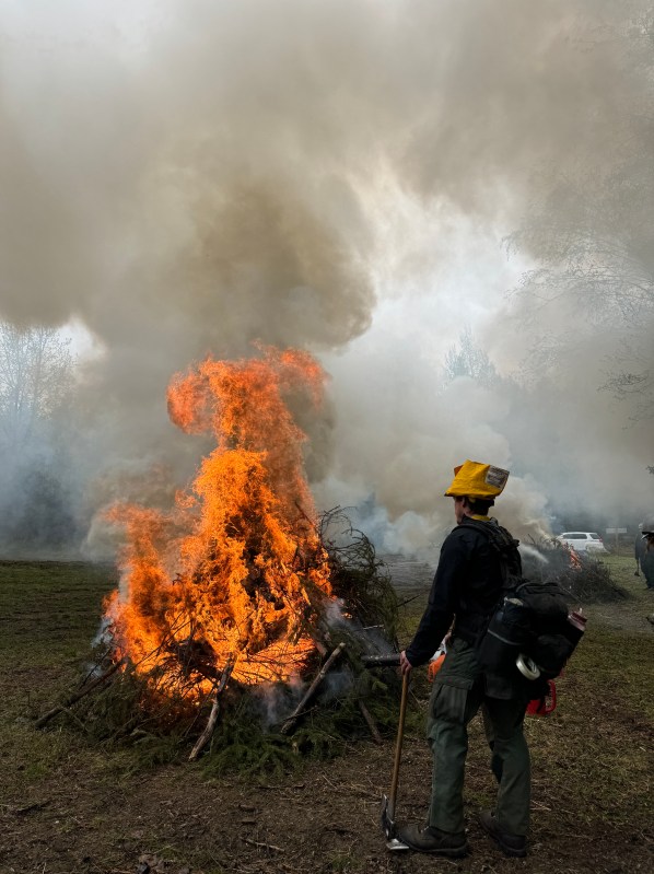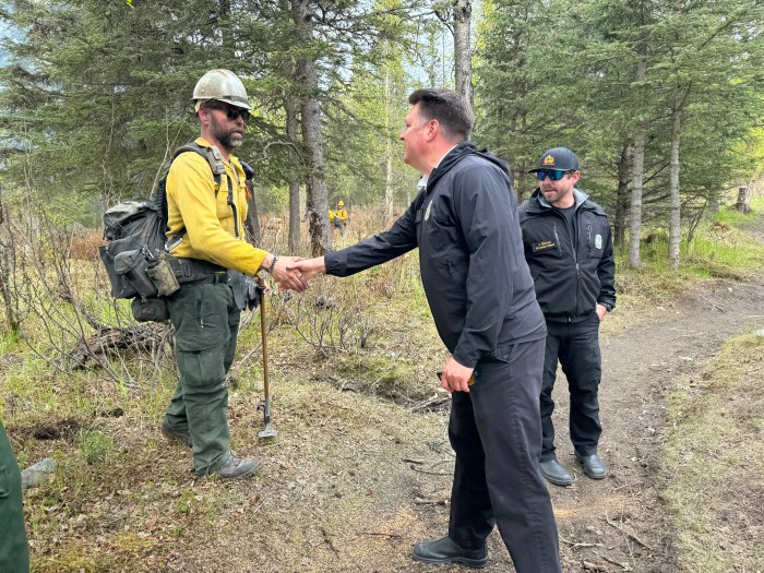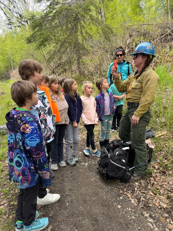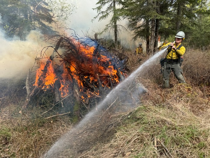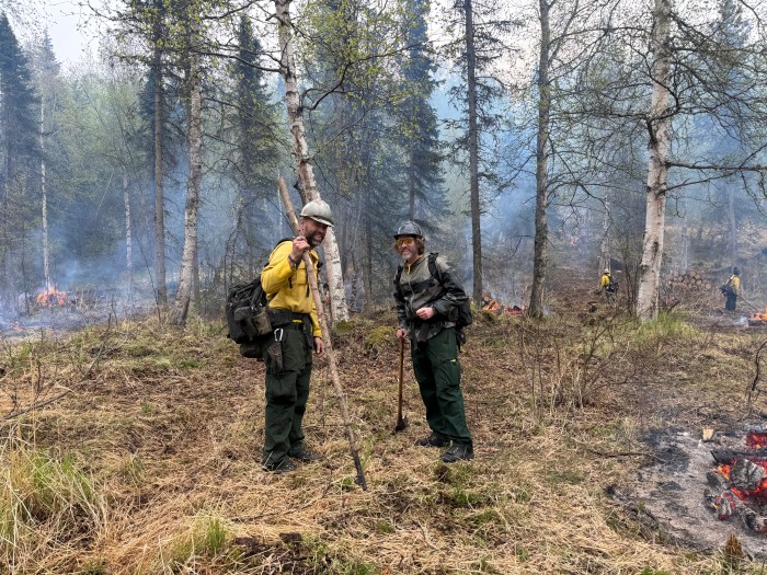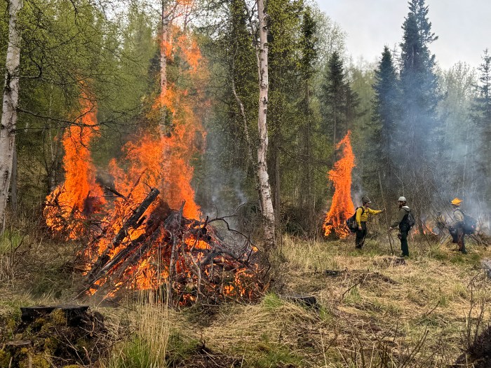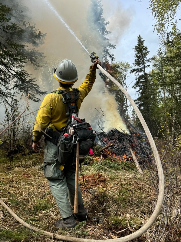 (Anchorage, AK) – For the greater part of May, the sound of chainsaws rang throughout the neighborhood and billows of white smoke rose from the forested area adjacent to the Hilltop Ski Area. Trail closed signs and caution tape were draped across popular single track trails. Firefighter crew vehicles filled the parking lots, while men and women donning green pants and yellow shirts worked the land to reduce hazardous fuels in an area of Anchorage where the forest meets the town, also referred to as the Wildland Urban Interface.