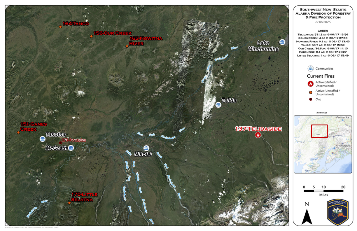 Fire managers are monitoring several new starts across Southwest Alaska, sparked under dry, warm conditions and a recent round of thunderstorm. Here’s a quick look at recent wildfire activity in the region: