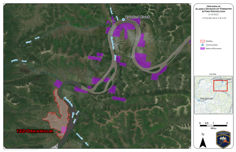 The Oskawalik Fire (#122) is now 1,779 acres and 15% contained, due to the efforts of 91 personnel working along the perimeter. Suppression operations continue to focus on limiting spread to the north and west, with aircraft and ground crews coordinating closely.