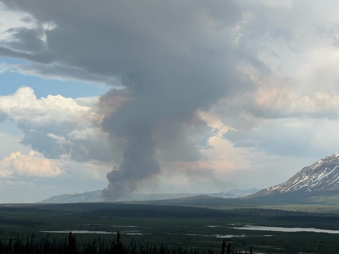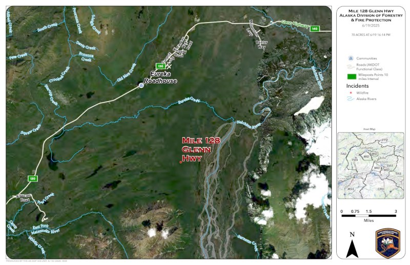 Firefighters and aviation assets from Palmer and Glenallen are currently responding to a new initial attack 4 miles southeast of the Eureka Roadhouse on the Glenn Highway. The initial size up indicated that the fire was burning in black spruce and tundra and approximately 70-100 acres in size and exhibiting extreme fire behavior with short runs and spotting ahead of the main fire. The fire will be visible to the public traveling through the Glenn Highway corridor between mile markers 120-136. The fire is plotted in a modified response area and at this time poses no impact to structures or public in the area.