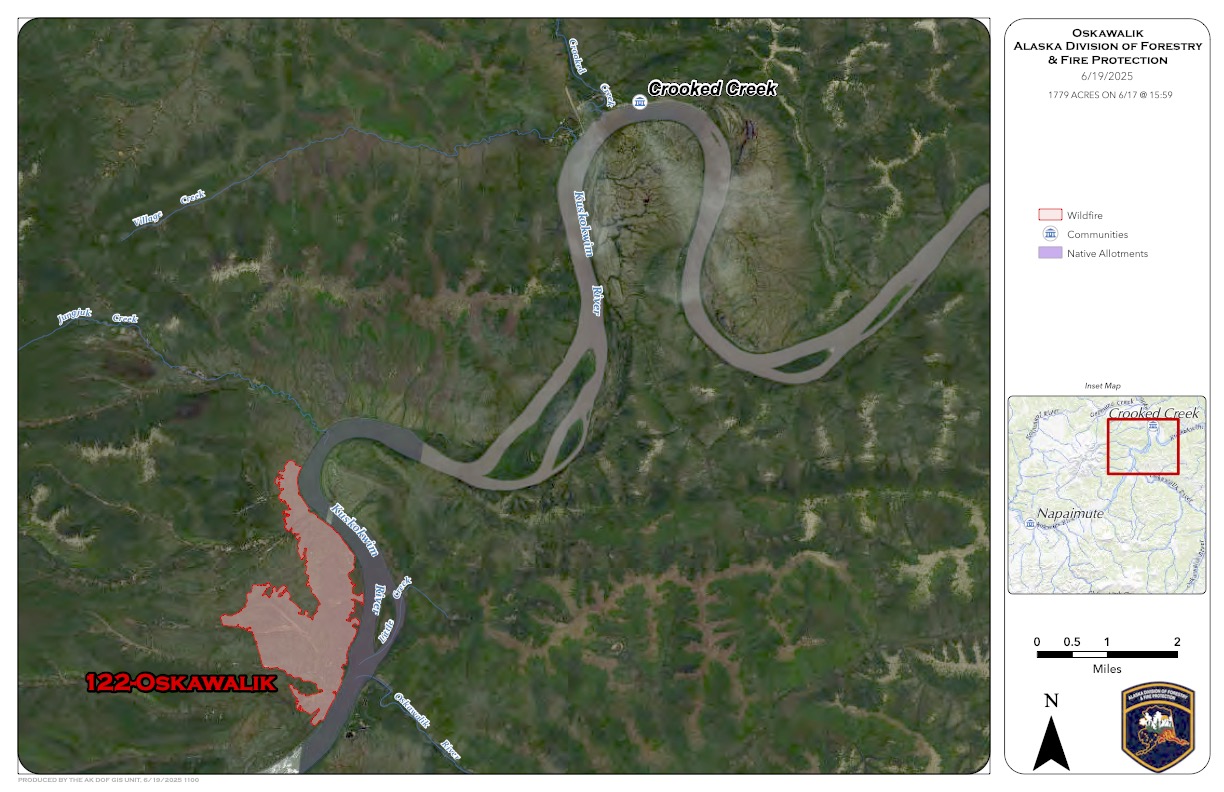 The Oskawalik Fire (#122) remains 1,779 acres in size and is now 20% contained. It is being managed under a full suppression strategy. Fire personnel on the incident increased to 105 today, with crews continuing to make strong progress towards containment efforts.
